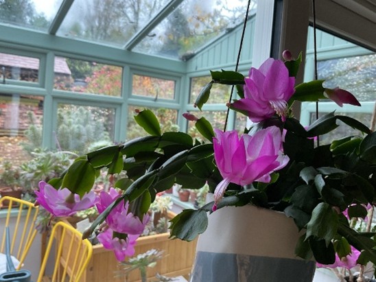Thanksgiving cactus, botanical name Schlumbergera truncata. This is a tropical, epiphytic cactus that blooms during the autumn. Below is one of mine in shades of pink! There are two other similar plants in the genus, Christmas flowering and Easter flowering, see diagram below showing the differences. At a time of the year when little else is flowering their cheerful blooms always make me smile, and if you have one of each variety then you can rest assured you will have beautiful blooming houseplants all through the dark cold seasons. To care for it, provide bright, indirect light, water when the top of the soil is dry, and ensure well-draining soil. It also appreciates cooler temperatures.
