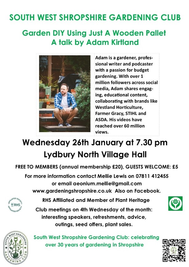 DUE ! Membership costs £20 to cover attendance at all our meetings for a year (from October); early access to trips and events with subsidised tickets; seed offers and plant sales. We are affiliated to the RHS so you can borrow our discount card which provides 50% discount for two people to any RHS garden. Such a bargain! Payment can be made with cash, cheque or card at our meetings or by transfer to: South West Shropshire Gardening Club sort code 20-53-22 account number 80754803. Please add your name as reference and email our Treasurer, Tina, to let her know: swsgcbookings@gmail.com