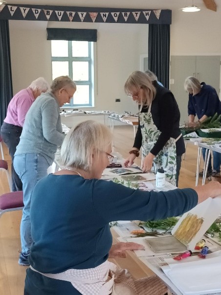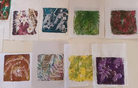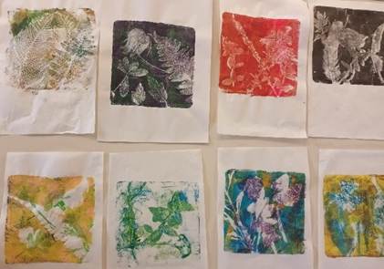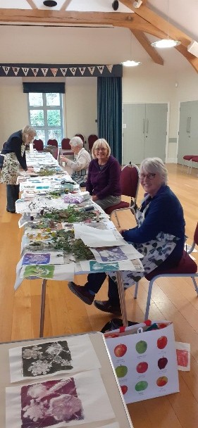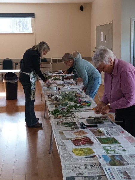 With these tools provided by Sarah Jameson, a Shropshire based artist, 14 garden club members attended monoprint workshops at Lydbury North Village Hall on the afternoons of September 25th and October 2nd. Gelplate printing creates a fresh, non-repeatable image. We used favourite plants gathered from our own gardens – leaves, flowers, ferns, grasses in the process, and guided by Sarah, created our own unique prints and cards. In a very practical and informal setting, we were encouraged and inspired by Sarah’s knowledge and skill to experiment with colours, shapes and textures to create our own masterpieces!